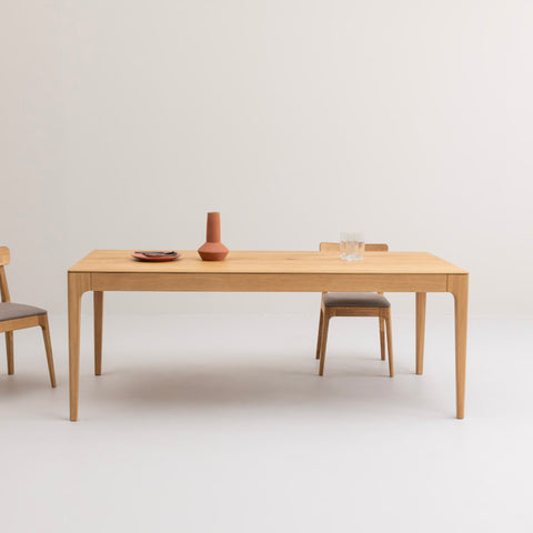 The CAROLINA Collection reimagines traditional design with curved legs and a shadow gap that gives the illusion of a floating tabletop. The collection includes dining tables with optional extensions, coffee tables, side tables, console tables, benches and matching chairs. Each piece is meticulously handcrafted by expert furniture makers using sustainable and locally sourced materials. The minimalist aesthetic is enhanced by the slim 2 cm thick tabletop, while the solid wood frame ensures strength and durability.