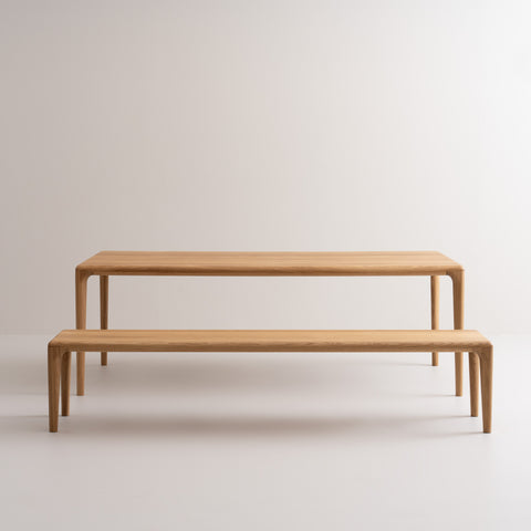 Available in oak or walnut with a matching bench, LÜNA S combines durability and elegance in a timeless form designed for modern gatherings.